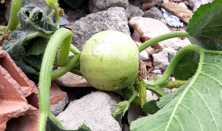 6 Şubat depremlerinde büyük hasar gören Adıyaman’da enkazlarda kabaktan ayçiçeğine, gülden incire kadar bitkiler yetişti.