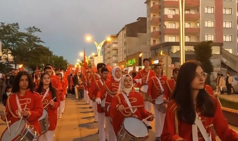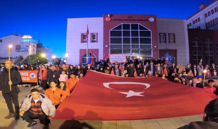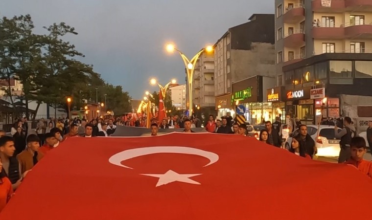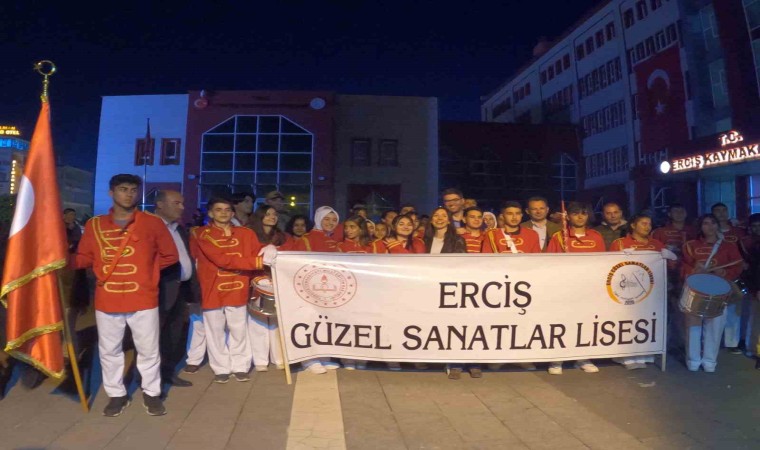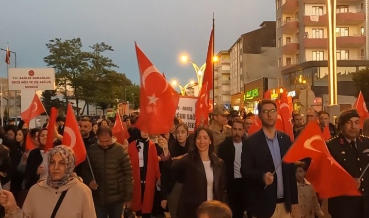 Erciş’te 19 Mayıs bayrak yürüyüşünde metrelerce uzunlukta Türk bayrağı taşıyan gençler, ellerinde meşaleler ve Türk bayraklarıyla katılan vatandaşlar, bando takımı eşliğinde Vanyolu Caddesi’nde bulunan İlçe Tarım Müdürlüğü önünden başlayarak Kaymakamlık binası önüne kadar yürüdü.