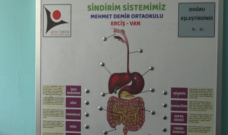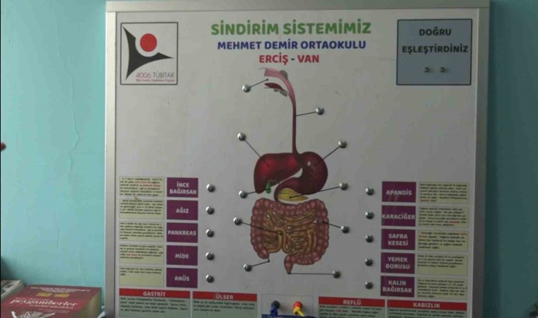 Erciş Mehmet Demir Ortaokulunda görev yapan Serpil Çürük, öğrencileriyle geliştirdiği materyallerle hem TÜBITAK 4006 yarışmasında dereceye girdi hem de Uluslar Arası Yenilikçi Öğretim Materyalleri Tasarım Yarışmasında dereceye girdi. Materyalle sindirim sistemindeki organları doğru eşleştiren Fen Bilgisi Öğretmeni Serpil Çürük, bu tarz çalışmayla daha verimli olduğunu söyledi. Serpil Çürük, “Sindirim sistemi panosu adıyla bir materyal tasarladım. Bu materyal sayesinde öğrenciler sindirim sistemini, yapı ve organlarını ve bunların görevlerini daha kolay şekilde öğreniyorlar. Bu materyalye TÜBITAK 4006 ile Uluslar Arası Yenilikçi Öğretim Materyalleri Tasarım Yarışmasında derece aldı. Bu projeyi temel olarak öğrencilerimle başlattım. 4006 sürecini öğrencilerimle birlikte yürüttüm” dedi.
