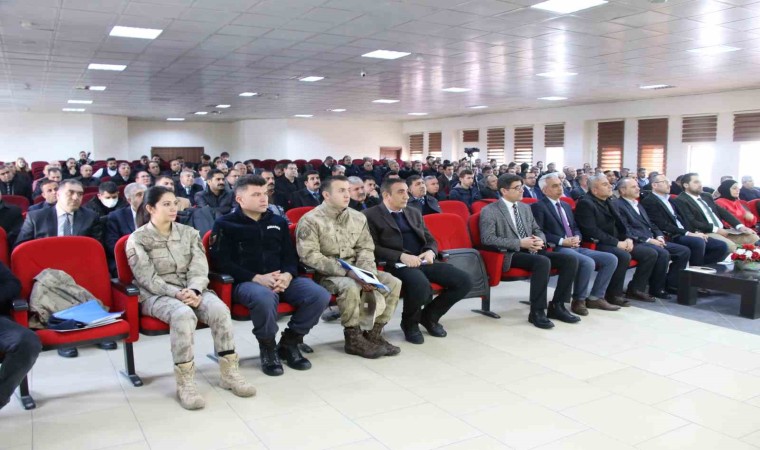 Erciş Kaymakamlığının konferans salonunda saygı duruşu ve İstiklal Marşı ile başlayan toplantıda konuşan Erciş Kaymakamı ve Belediye Başkan Vekili Murat Karaloğlu, 2023-2024 eğitim öğretim yılının 2. yarı yılının başladığını hatırlatarak, “Bu vesileyle hem bir araya gelelim istişare edelim, okullarımızın eksikleri varsa bunları hep birlikte konuşalım, çözebildiklerimizi çözelim çözemediklerimizi ilgili yerlere aktararak çözüm bulalım. Ayrıca okul güvenliği konusunda birçok karar almaktayız. Yine okul çevrelerimizde metruk binalarla ilgili sorun olan varsa bunları ivedilikle okul idarecilerinin emniyet teşkilatımıza bildirmesi gerekiyor. Bu konularda İçişleri ve Milli Eğitim bakanlıklarımız çok hassas. Malum metruk binalarda nahoş şeyler olmakta. Bunları engellemek için biz elimizden gelen gayreti göstermekteyiz. Okul servisleri ile ilgili bizim kolluk kuvvetlerimiz denetimini yapıyor ama bunu siz okullarda öğrenci alırken servisçileri kontrol edin, okul kantinlerimizi de biz denetlettiriyoruz. Çocuklarımız bizim için çok değerli, sizler için de çok kıymetli olduğuna biz inanıyoruz. Okul kantinlerimizde hassas olalım, okul etraflarında açıktan sigara, alkol ve benzeri ürünler satan market ve benzeri işletmeler varsa bunları bize bildirin” dedi.