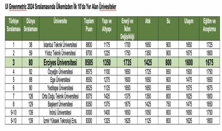 Dünya üniversitelerini çevreye duyarlılık, enerji ve iklim değişikliği, atık, ulaşım yönetimi ve sürdürülebilirlik alanlarında değerlendiren UI GreenMetric Dünya Üniversiteleri Sıralama Sistemi 2024 yılı sonuçları açıklandı. Erciyes Üniversitesi 1477 üniversitenin sıralandığı değerlendirmede dünya üniversiteleri arasında 80. sırada, Türkiye Üniversiteleri arasında sıralamaya giren 120 üniversite içerisinde 3. sırada yer aldı.