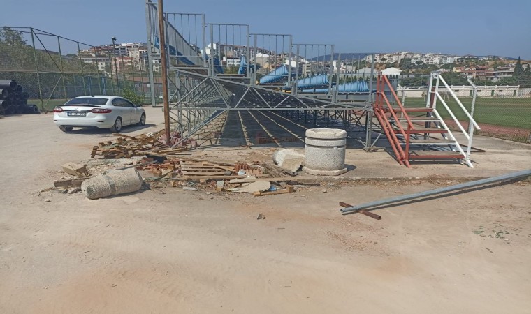 Balıkesir’in Erdek ilçesinde bulunan Erdek 18 Eylül Stadyumu gelişi güzel bırakılan inşaat malzemeleri nedeniyle adeta şantiyeye döndürüldü.