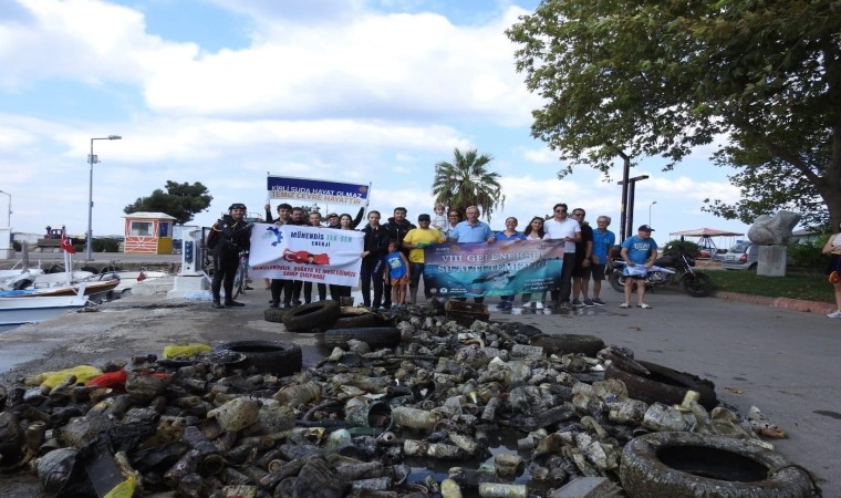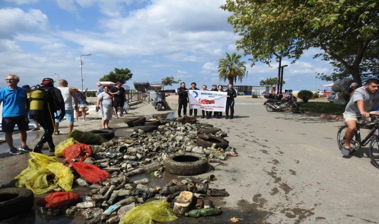 Balıkesir’in Erdek ilçesinde su altı temizlik farkındalığı oluşturmak için etkinlikte balıkadam kıyafetleri giyen dalgıçların yarım saatlik dalışında, 200 metrekarelik alanda temizlik yapıldı.