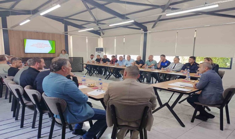 İlçede önemli bir ekonomik değer olan zeytinin korunması amacıyla yapılan toplantıya, ilgili kamu kurumları, sivil toplum kuruluşları, muhtarlar, zeytin alımı yapan işletmelerin sahipleri ve bölgedeki üreticiler katıldı.