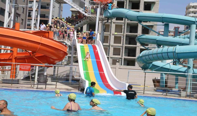 Hava sıcaklığı ile birlikte nemin etkisinin hayatı zorlaştırdığı iller arasında yer alan Mersin’in Erdemli ilçesinde çocuklar havuzlara akın etti.