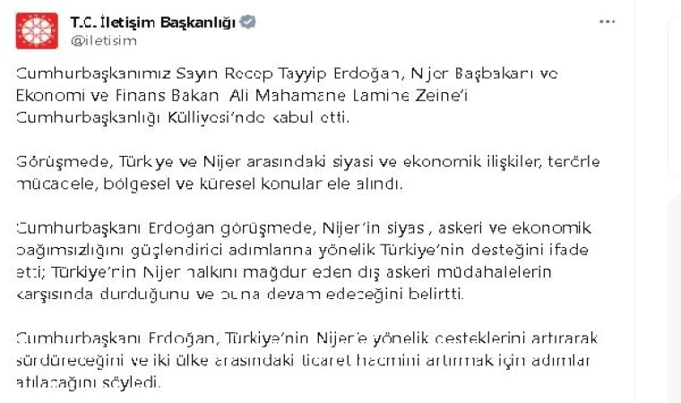 İletişim Başkanlığı'nın sosyal medya hesabından, Cumhurbaşkanı Recep Tayyip Erdoğan ve Nijer Başbakanı ve Ekonomi ve Finans Bakanı Ali Mahamane Lamine Zeine'i ile yapılan görüşmeye ilişkin yapılan açıklamada, "Cumhurbaşkanımız Sayın Recep Tayyip Erdoğan, Nijer Başbakanı ve Ekonomi ve Finans Bakanı Ali Mahamane Lamine Zeine'i Cumhurbaşkanlığı Külliyesi'nde kabul etti. Görüşmede, Türkiye ve Nijer arasındaki siyasi ve ekonomik ilişkiler, terörle mücadele, bölgesel ve küresel konular ele alındı. Cumhurbaşkanı Erdoğan görüşmede, Nijer'in siyasi, askeri ve ekonomik bağımsızlığını güçlendirici adımlarına yönelik Türkiye'nin desteğini ifade etti; Türkiye'nin Nijer halkını mağdur eden dış askeri müdahalelerin karşısında durduğunu ve buna devam edeceğini belirtti. Cumhurbaşkanı Erdoğan, Türkiye’nin Nijer’e yönelik desteklerini artırarak sürdüreceğini ve iki ülke arasındaki ticaret hacmini artırmak için adımlar atılacağını söyledi" denildi. (DHA)