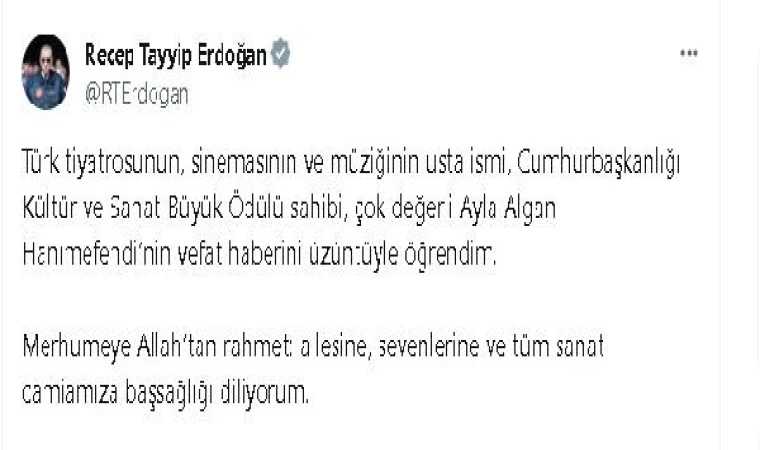 Taha AYHAN/ ANKARA, (DHA)- CUMHURBAŞKANI Recep Tayyip Erdoğan, vefat eden tiyatro ve sinema sanatçısı, Cumhurbaşkanlığı Kültür ve Sanat Büyük Ödülü sahibi Ayla Algan için başsağlığı mesajı paylaştı.
