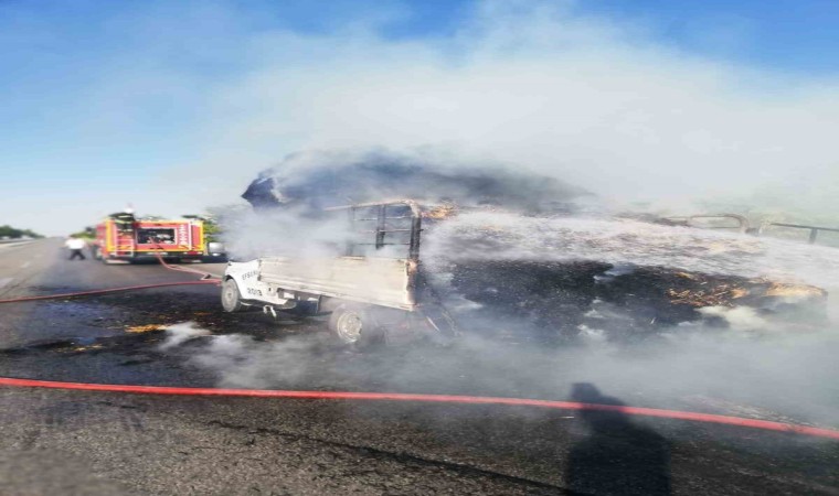 Konya’nın Ereğli ilçesinde saman yüklü kamyonet, seyir halindeyken alev aldı.