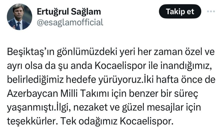 Beşiktaş’ta Rıza Çalımbay’dan boşalan teknik direktörlük koltuğu için "Ertuğrul Sağlam ile anlaşıldı" iddialarına Sağlam’dan yanıt geldi. Kocaelispor Teknik Direktörü Ertuğrul Sağlam, konuyla alakalı resmi sosyal medya hesabında açıklama yaptı. Kocaelispor ile hedefe odaklandıklarını belirten Sağlam, “Beşiktaş’ın gönlümüzdeki yeri her zaman özel ve ayrı olsa da şu anda Kocaelispor ile inandığımız, belirlediğimiz hedefe yürüyoruz. İki hafta önce de Azerbaycan Milli Takımı için benzer bir süreç yaşanmıştı. İlgi, nezaket ve güzel mesajlar için teşekkürler. Tek odağımız Kocaelispor” ifadelerine yer verdi.