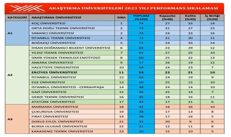 Araştırma Üniversitelerinin 2023 yılı verileri dikkate alınarak yapılan performans sıralamasında Erciyes Üniversitesi (ERÜ) devlet üniversiteleri arasında 8. sırada yer aldı.