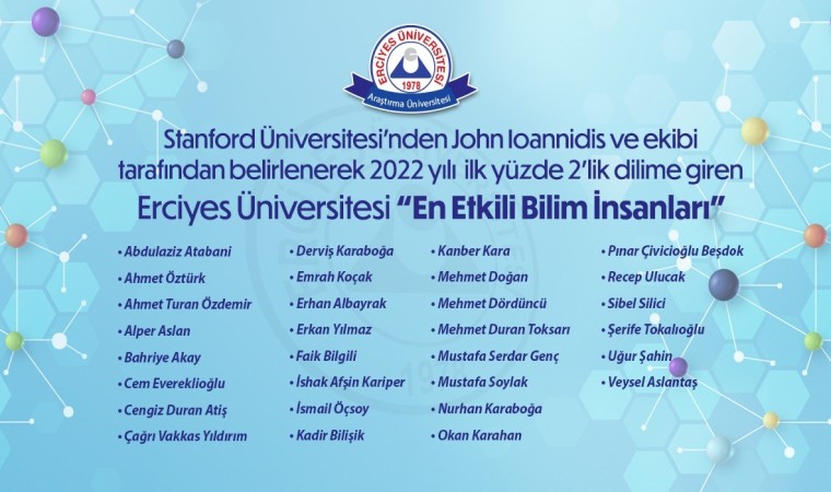 Stanford Üniversitesi’nden John Ioannidis ve ekibi tarafından; yayın sayıları, atıf sayıları, h-indeksi, hm-indeksleri gibi farklı değişkenler kullanılarak oluşturulan ve PLOS Biology dergisinde yayımlanan 2022 yılı ilk yüzde 2’lik dilime giren ’En Etkili Bilim İnsanları’ listesi açıklandı. Açıklanan listeye göre Erciyes Üniversitesi’nden (ERÜ) 30 öğretim üyesi listeye girme başarısı gösterdi.