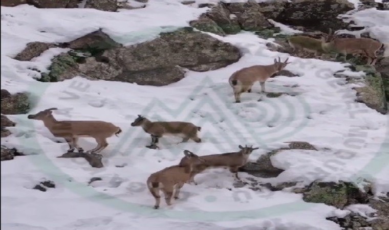 Erzincan’da karlı kaplı Munzur Dağları’nda yiyecek arayan dağ keçileri drone ile havadan görüntüledi.