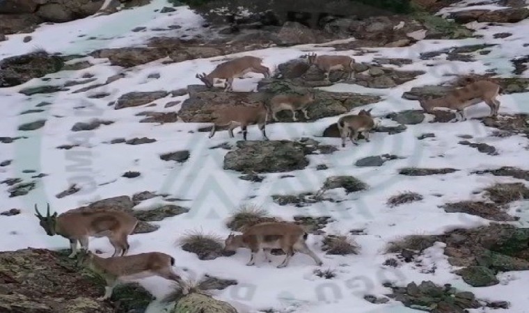 Yaban hayatının zengin olduğu Erzincan’da nesli tükenmekte olan ve koruma altında bulunan dağ keçileri karlı arazide yiyecek ararken DKMP ekiplerince drone ile kaydedildi. Yükseklerde yaşadığı için nadir görülen dağ keçileri doğaseverleri mest etti. Yakından görüntülenen sürü halindeki dağ keçileri belgesel niteliğinde görüntüler ortaya çıkardı. Karlı arazide kendi doğasında görüntülenen dağ keçileri doğaseverlerin beğenisine sunuldu.