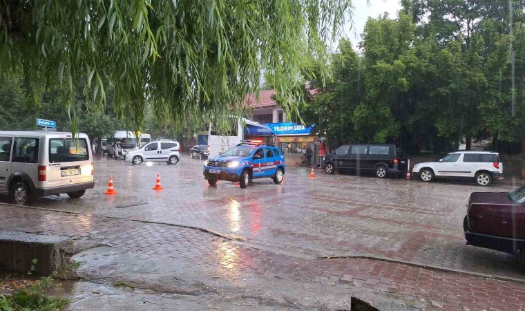 Beldede aralıklı sağanak yağış devam ederken riskli noktalar jandarmanın megafonla uyarısıyla boşaltıldı.