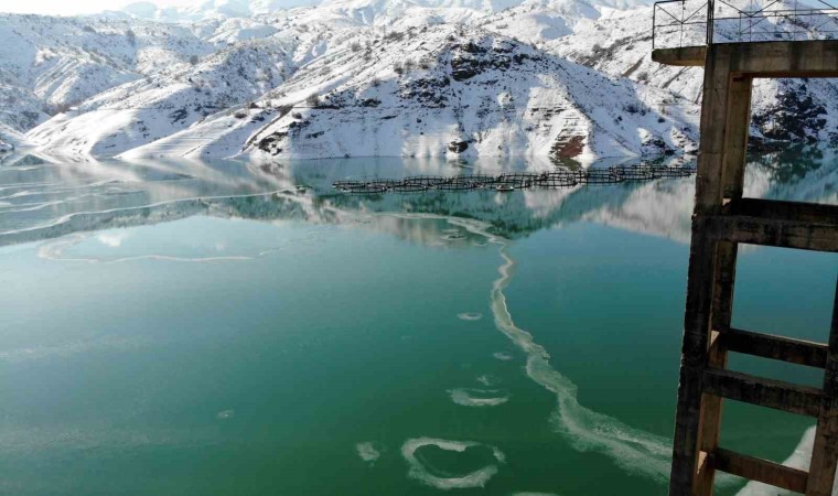 Yaz mevsiminde yaklaşık 48 bin dekarlık tarım arazisini sulamak için kullanılan, aynı zamanda kafes balıkçılığı da yapılan barajda, balık kafesleri buz kütlesinin altında kaldı.