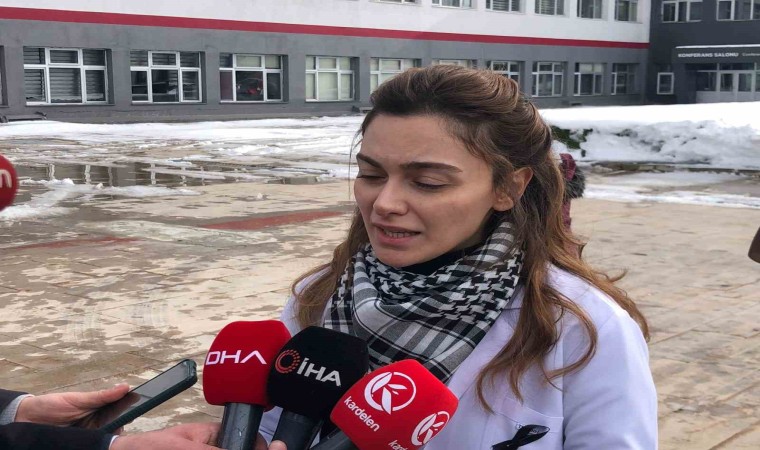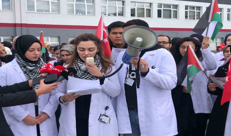 Basın açıklamasını okuyan Radyoloji Bölümü Araştırma Görevlisi Melek Sevda Ateş, “Aynı gökyüzünün altında nefes alan, dünyanın dört bir yanındaki vicdan sahibi insanlar; ortak bir amaç uğruna zulme karşı seslerini yükseltiyor ve Gazze’deki katliama karşı tepkilerini ortaya koyuyorlar. Bugün burada, insan olmak ve insan olarak kalabilmek için, kısacası insanlık adına bir araya geldik ve birbirimizle el ele verdik. Ruh dünyamızı felç eden, hepimizin gözleri önünde yaşanan bu barbarlığın muhatabı olan masum Gazze Halkı’nın bizi vicdana çağıran çığlıklarını duyurmak için buradayız. Ne yazık ki Siyonist İsrail hükümetinin Gazze’deki katliamları yeni değil, tam 75 yıldır devam etmektedir. İşgalci İsrail Hükümeti 7 Ekim’den beri, ’kendini savunma’ propagandası aldı altında Gazze’de her türlü savaş suçunu işlemekte ve bir soykırım gerçekleştirmektedir. Bugün bu soykırımın 49. günündeyiz; son verilere göre tam 14 bin 128 savunmasız sivil öldürülmüştür, ölenlerin 5 binini çocuklar oluşturmaktadır. 20 Kasım Dünya Çocuk Hakları Günü’nde Gazze’deki binlerce masum çocuğun, en temel hakkı olan yaşama hakkı ellerinden alınmıştır; 20 Kasım artık dünya utanç günüdür. UNICEF’in verilerine göre 800 binden fazla çocuk ve 1 milyon 700 bin Gazzeli vatanlarından tehcir edilmiştir. Saldırılar neticesinde, cenazeleri sokakta veya enkaz altında kalan 4 bin 500’ü kadın ve çocuk olmak üzere 6 bin 800 kişi kayıptır” dedi.