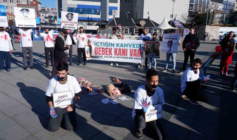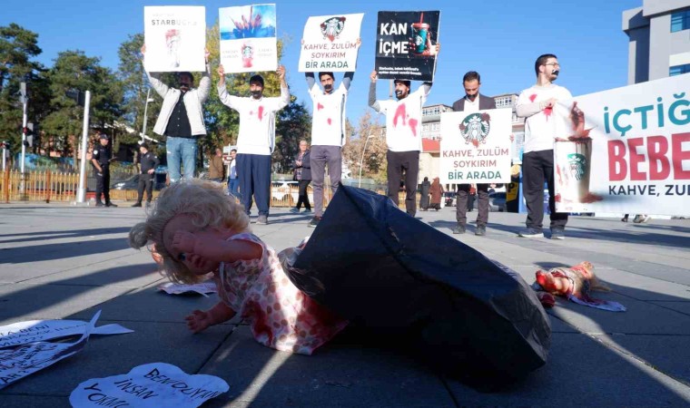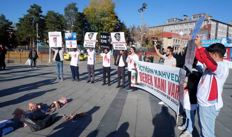 Erzurum’da bir araya gelen gençler, önce ABD’li ünlü kahve markası Starbucks’ın önünde eylem yaparak ABD ve İsrail’i protesto etti. Burada pankart açan grup, Gazze’de bebeklerin katledilişini temsilen yere kana bulanmış oyuncak bebekler koydu, ağızlarını bantlayarak dünya devletlerinin suskunluğuna dikkat çekti. “İçtiğin kahvede bebek kanı var. Kahve, zulüm ve soykırım bir arada. İçmezsen ölmezsin, içersen ölürler. Katile ortak olma” yazılı pankartlar açan grup, daha sonra Havuzbaşı Kent Meydanı’nda da benzeri bir eylem yaptı. Gruba zaman zaman vatandaşlar da destek verdi.