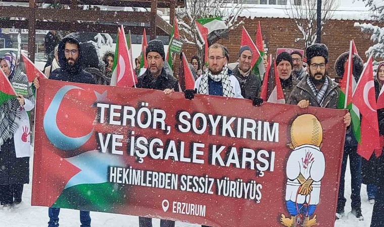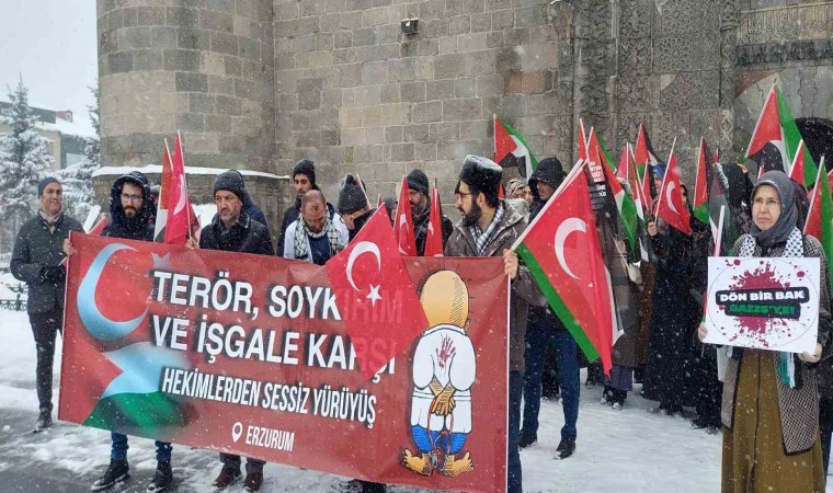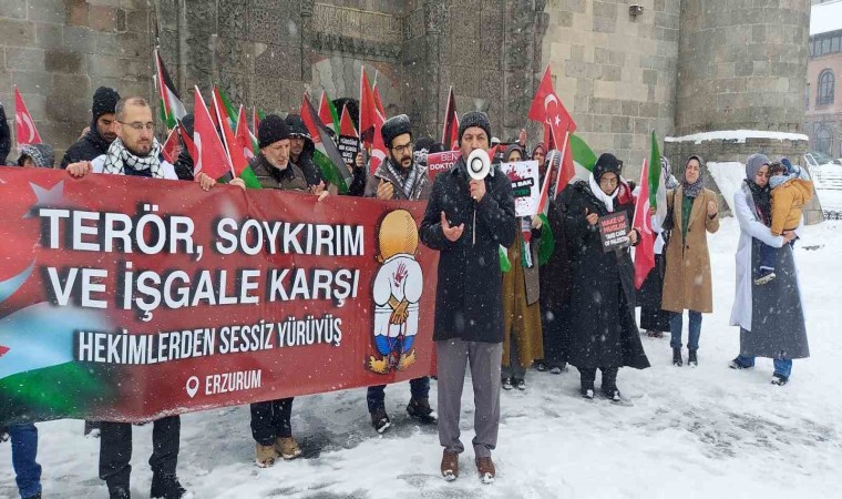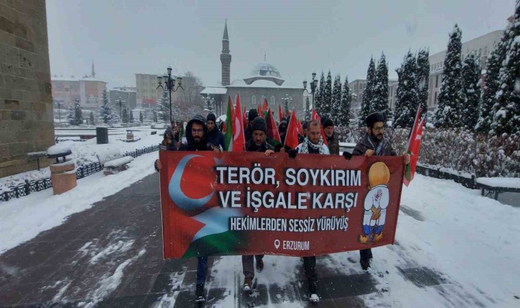 Erzurum’da görev yapan sağlık çalışanları kar yağışı altında İsrail’in Gazze’ye yönelik saldırılarını protesto etmek için "sesiz yürüyüş" yaptılar.
