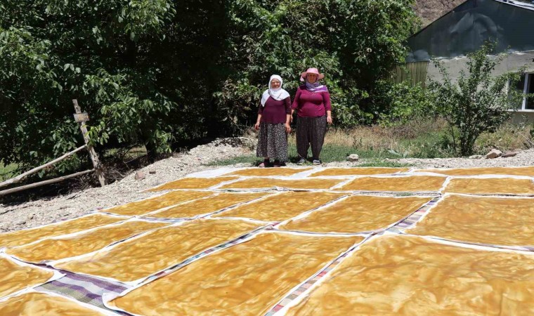 Erzurum’un Olur ilçesine bağlı Ormanağzı Mahallesi’nde yağmurlu havanın yerini güneşli havaya bırakmasıyla Karnavas dut pestili yapımı başladı.
