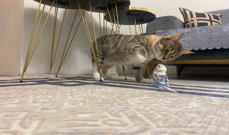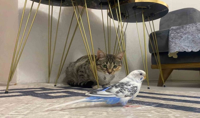 Erzurum’da Özünal ailesinin muhabbet kuşu ile yavru kedileri arasındaki dostluk görenleri hem hayrete düşürüyor hem de gülümsetiyor.