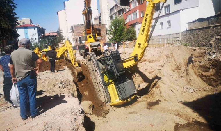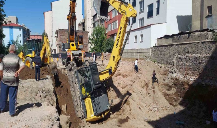 Erzurum şehir merkezinde bir binanın temel hafriyatının alınması esnasında iş makinesinin aniden devrilmesi ve ters dönmesi herkesi korkuttu.