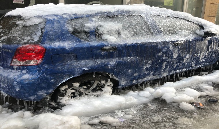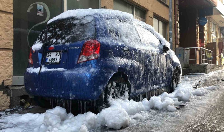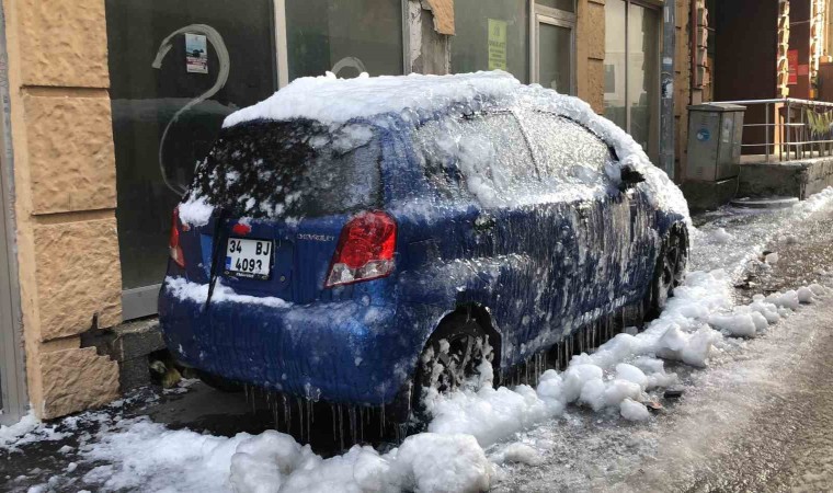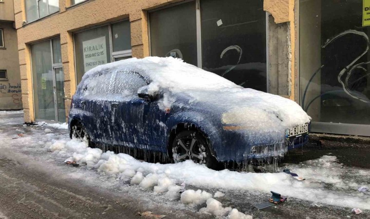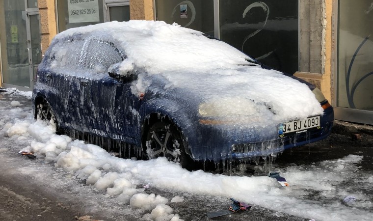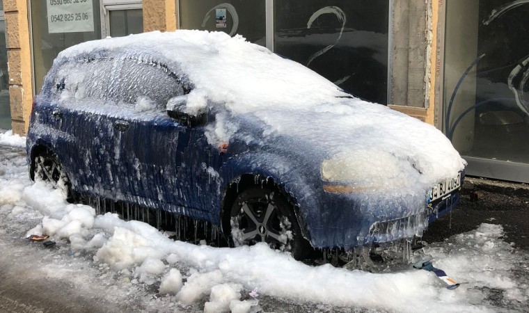 Cumhuriyet Caddesi’nin ara sokaklarının birinde üzerine kar yağan ve daha sonra çatılardan akan suların donması yüzünden neredeyse buzla kaplanan otomotiv görenleri şaşkına çevirdi. Araç sahibinin şehir dışında olması nedeniyle müdahale edilemeyen ve yerinden de kaldırılmayan aracın üstünün neredeyse tamamı buzla kaplandı.