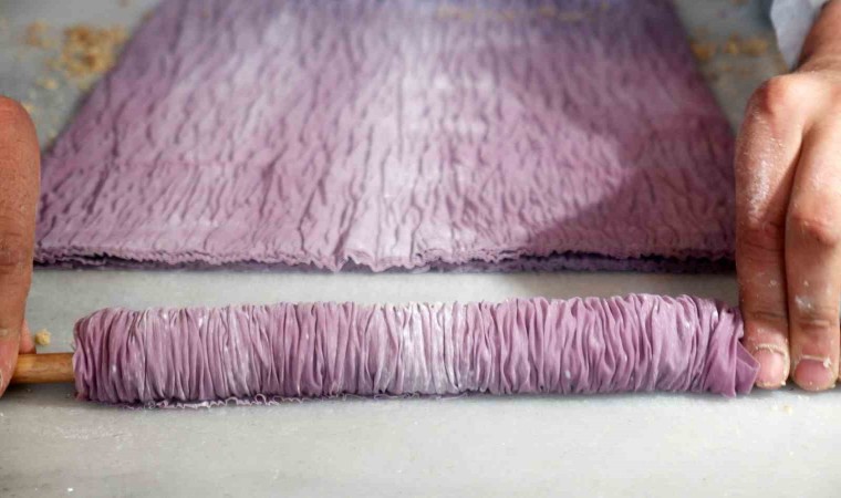 Kadayıf dolmasıyla meşhur Erzurum’da baklava ustası Selami Atiş, Kurban Bayramı öncesi diyabet hastaları için mor un ve meyvelerden baklava üretiyor.