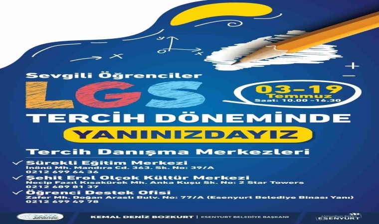 LGS sınavının ardından tercih heyecanı başladı ve Esenyurt Belediyesi, her yıl olduğu gibi bu yıl da öğrencilere rehberlik ediyor. Belediye, Sürekli Eğitim Merkezi'nde sunulan 'LGS Hazırlık' kurslarıyla başarılı sonuçlar elde eden öğrencilerin yanı sıra ilçedeki tüm çocuklara 'Tercih Danışmanlık Hizmeti' sunuyor.