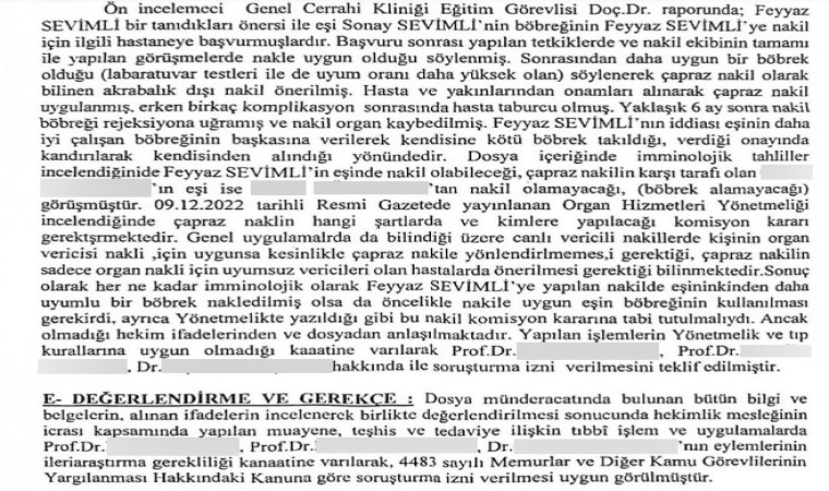 Şikayet üzerine Sağlık Bakanlığı konuyla ilgili inceleme başlattı. Sağlık Bakanlığı, geçtiğimiz Haziran ayında konuyla ilgili ön incelemeye tamamladı ve raporunda; “Feyyaz Sevimli’nin eşinin böbreği uygun olmasına rağmen doktor O.S. tarafından daha uyumlu denilerek çapraz nakil önerilmiştir. 09.12.2022 tarihli Resmi Gazete’de yayınlanan Organ Hizmetleri Yönetmeliği incelendiğinde çapraz naklin hangi şartlarda ve kimlere yapılacağı komisyon kararı gerektirmektedir. Feyyaz Sevimli’ye yapılan nakilde eşininkinden daha uyumlu bir böbrek nakledilmiş olsa da öncelikle nakile uygun eşin böbreği kullanılması gerekirdi. Çapraz nakil komisyon kararına tabi tutulmalıydı” denildi.