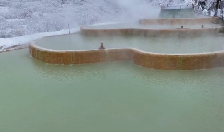 Bursa’nın İnegöl ilçesinde karla kaplı dağların arasında 70 derece sıcakta kaynayan sıcak su, doğaseverlere kar üzerinde termal fırsatı sunuyor. Tamamen doğal şartlarda kaynayıp havuzlara biriken termal sulara-10 derecede bile giren vatandaşlar dışarıda adeta termal hamam keyfi yapıyor.