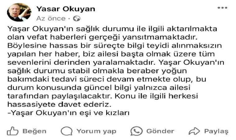 Yaşar Okuyan, akciğer rahatsızlığı nedeniyle Ankara'da tedavi gördüğü özel hastanede önceki gün iç kanama geçirdi. Yoğun bakım servisine alınan Okuyan'ın entübe edildiği belirtildi. Ailesi, Yaşar Okuyan'ın sosyal medya hesabından yaptığı açıklamada, vefat ettiği yönündeki haberleri yalanlayarak, "Yaşar Okuyan'ın sağlık durumu stabil olmakla beraber yoğun bakımdaki tedavi süreci devam etmekte olup, bu durum hakkında güncel bilgi yalnızca ailesi tarafından paylaşılacaktır. Konu ile ilgili herkesi hassasiyete davet ederiz" ifadelerini kullandı.