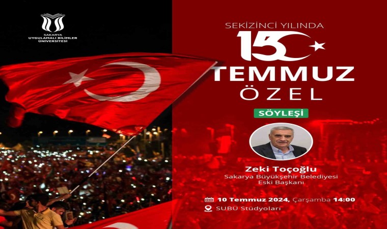 Sakarya Uygulamalı Bilimler Üniversitesi (SUBÜ) tarafından 15 Temmuz Demokrasi ve Milli Birlik Günü nedeniyle SUBÜ Konuşmaları kapsamında ‘15 Temmuz Özel’ başlıklı bir söyleşi düzenlenecek. Sakarya Büyükşehir Belediyesi Eski Başkanı Zeki Toçoğlu’nun konuşmacı olarak katılacağı söyleşi, 10 Temmuz Cuma günü saat 14.00’te SUBÜ Haber YouTube kanalından canlı yayınlanacak. Moderatörlüğünü Yazar-Sunucu Yahya Bakır’ın üstleneceği söyleşide 15 Temmuz gecesi Valilik ve Demokrasi Meydanı’nda yaşananlar, şehrin verdiği reaksiyon ve ardından gerçekleşenler konuşulacak. Söyleşi daha sonra da istenildiği zaman YouTube üzerinden izlenebilecek.