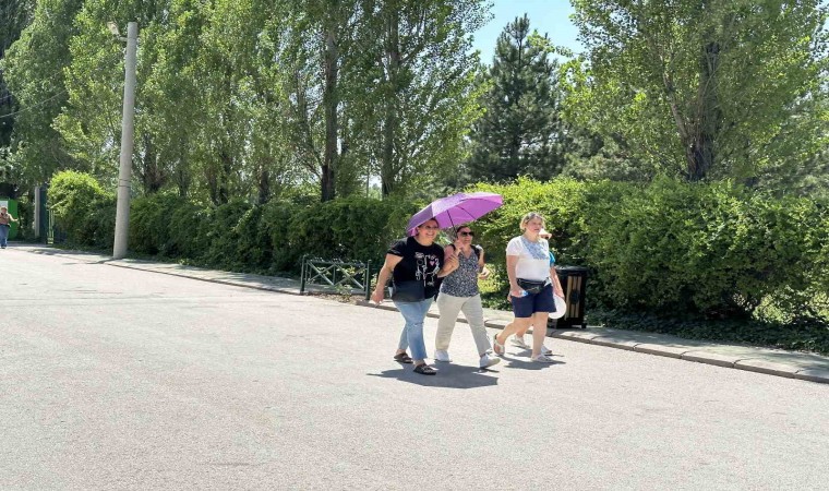 Eskişehir’de sıcak havadan bunalan vatandaşlar, güneşten korunmak için şemsiye kullandı.