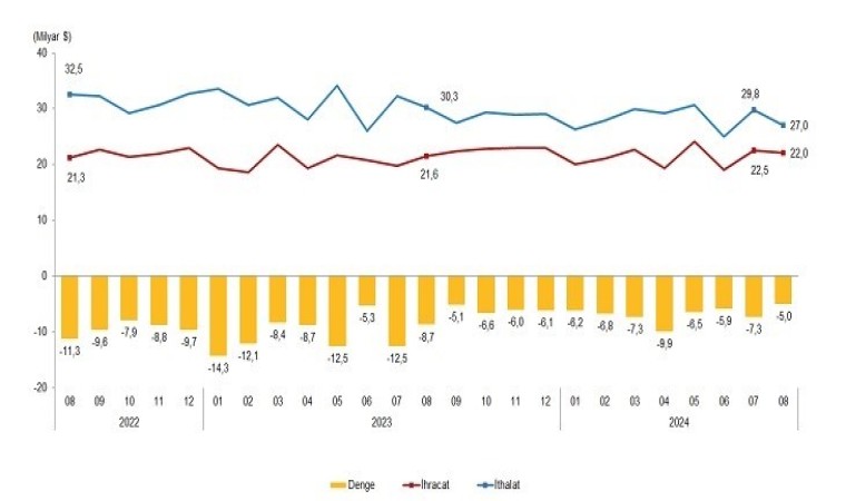 TÜİK ile Ticaret Bakanlığı iş birliğiyle genel ticaret sistemi çerçevesinde üretilen geçici dış ticaret verileri açıklandı. Yayınlanan ’Dış Ticaret İstatistikleri, Ağustos 2024’ verilerine göre; yurt genelinde ihracat 2024 yılı Ağustos ayında bir önceki yılın aynı ayına göre yüzde 2,3 artarak 22 milyar 48 milyon dolar, ithalat da yüzde 10,7 azalarak 27 milyar 40 milyon dolar olarak gerçekleşti. Eskişehir’de ise ağustos ayında ihracat yüzde 5,0, ithalat yüzde 10,6 oranında artış gösterdi.
