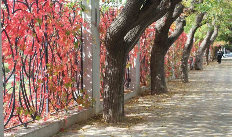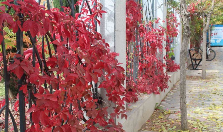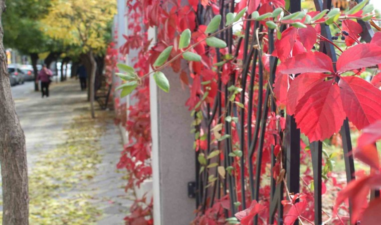 Sonbahar aylarının gelmesiyle birlikte ağaç yaprakları renk değiştirmeye başladı. Eskişehir’de Millet Bahçesi’nin Mustafa Kemal Atatürk Caddesi tarafında yer alan korkulukları kaplayan sarmaşıktaki kızıl ile kaldırımda bulunan ağaçlardaki yeşil yaprakların görüntüsü ilgi çekiyor. Sarmaşıkların kızıla döndüğü görülürken, kaldırımdaki akasya ağaçlarının yeşil yaprakları ile diğer ağaçların sararmış görüntüsünün birlikte meydana getirdiği renk uyumu fotoğraflık manzara ortaya çıkarıyor. Bölgeden geçen bazı vatandaşlar, adeta kartpostallık olan manzarayı, “Sonbaharda yaprakların görüntüsü güzel görüntü oluşturmuş. Renkler birbiriyle çok uyumlu. Bu aylarda bu şekilde hoş görüntüler oluyor” şeklinde yorumladılar.