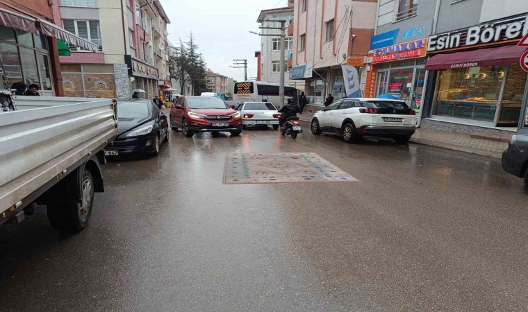 Odunpazarı İlçesi’nde bulunan Emek Mahallesi Dilek Caddesi’nde bir esnaf, halısını yağmur suyunda yıkamak için ilginç bir çözüm buldu. Yağmurun etkili olduğu bir saatlerde, esnafın halısını yol ortasına serdiği ve yağmur suyuyla ıslattığı görüldü. Bu ilginç görüntü, geçen araçların durmasına neden oldu. İlk başta hayretle karşılanan durum, araç sürücülerinin halının üzerinden geçerek temizlenmesini sağladığını gösterdi.