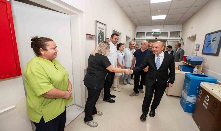 Görev teslim töreninin ardından hastanedeki hastaları da ziyaret eden Başkan Tunç Soyer, akciğer ve beyin tümörü ameliyatı olan 61 yaşındaki Hüseyin Cemal Özgüler ile evde bakım hizmet biriminde yatarak tedavi gören Niyazi Akkoç’u ziyaret etti. 41 yaşındaki Akkoç Başkan Soyer’i karşısında görünce duygularını gizleyemeyerek, “Burada bana çok iyi bakıyorlar. Allah doktorlarımızdan bin kere razı olsun. Sırtınız yere gelmesin. Yatak yaram vardı sizlerin sayesinde geçti” dedi.