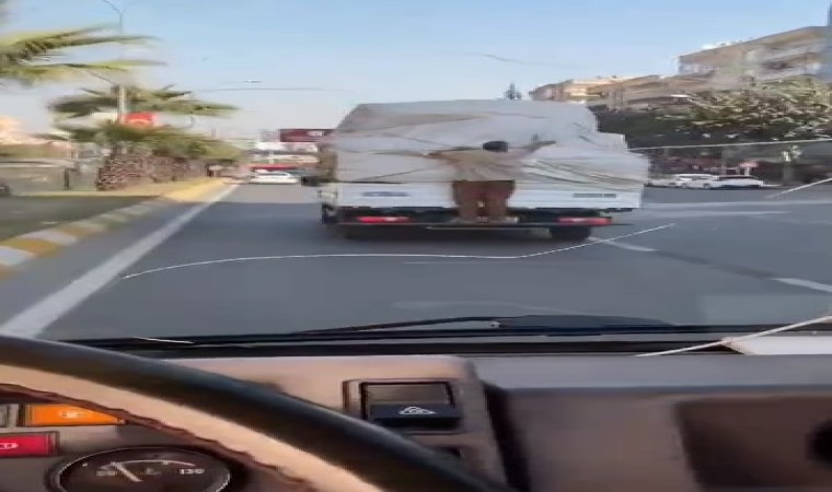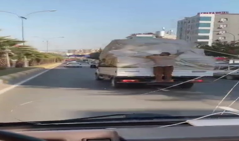 Olay, trafik akışının en yoğun olduğu Şanlıurfa-Mardin karayolu İpekyol mevkiinde meydana geldi. İddiaya göre, eşya yüklü bir kamyonetin kasasına tutunan bir kişi, tehlikeye rağmen kilometrelerce yolculuk etti. Yürekleri ağza getiren tehlikeli yolculuk dakikalarca sürdü. Hem kendisinin hem de trafiktekilerin canını tehlikeye atan şahıs, seyir halindeki başka bir araç sürücüsü tarafından cep telefonu kamerası ile saniye saniye kayıt altına alındı.