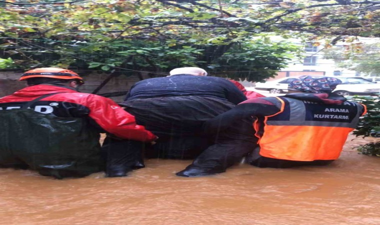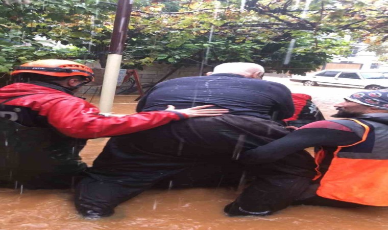 Akçaalan Mahallesi 4113 No.’lu Sokak’ta yaşayan ve yağmur sebebiyle evde mahsur kalan baba Yalçın Bodur (75) ile kızı Filiz Bodur (54) oğlu Ahmet Bodur’un (58) 112’yi arayıp yardım istemesinin ardından AFAD ve MAKSAT ekipleri harekete geçti. Sağlık ekipleri ile birlikte eve ulaşan kurtarma ekipleri yaşlı adamı sırtına alarak evden çıkarttı. Yaşlı adamın kızı ve oğlunu da evden alan ekipler, mahsur kalanların sağlık kontrollerinin yapılmasının ardından ev ve çevresindeki suyu tahliye çalışmalarına başladı.