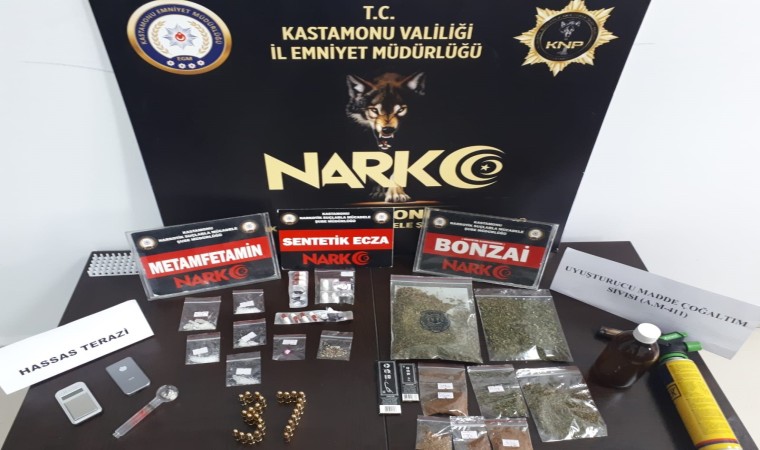 Edinilen bilgiye göre, Kastamonu İl Emniyet Müdürlüğü Narkotik Suçlarla Mücadele Şube Müdürlüğü ekiplerince tespiti yapılan bir şahsın evinde arama yapıldı. Aramada 547,93 gram bonzai ham maddesi, 2,92 gram metamfetamin, 62,27 gram kannabinoid, 12 adet sentetik ecza hapı, 0,76 gram kenevir tohumu, 1 adet ecstasy hap, 1 adet hassas terazi, 26 adet tabanca fişeği ile 1 adet uyuşturucu içiminde kullanılan cam düzenek ele geçirildi.