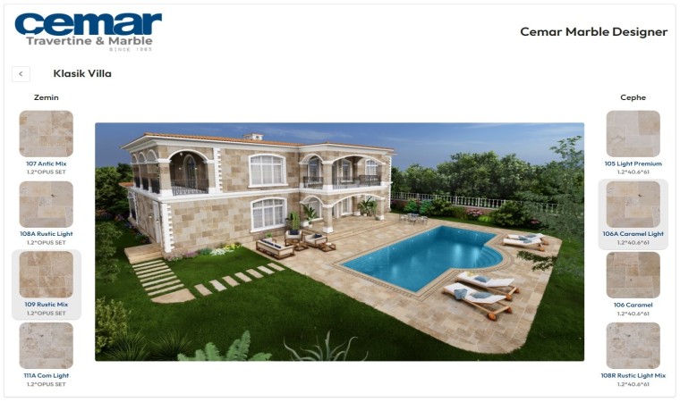 Manisa’nın Kula ilçesinde bulunan Cemar Traverten-Mermer, gerek dünyanın dört bir yanına gerçekleştirdiği ihracatla gerekse de inovatif çalışmalarla sektöre yenilikler katarak öncü olmaya devam ediyor. “Cemar Marble Designer” uygulamasını web sitesi üzerinden kullanıcılara sunan Cemar, bu uygulamayla müşterilerinin karar verme sürecine katkıda bulunuyor. Web sitesinde bulunan “Cemar Marble Designer” bölümüne gelen müşteriler burada doğal taş uygulayacakları alanlara uygun modeli seçtikten sonra hangi taşın hangi mekanda nasıl bir görünüm kazandırdığını deneyimlemiş olacak.