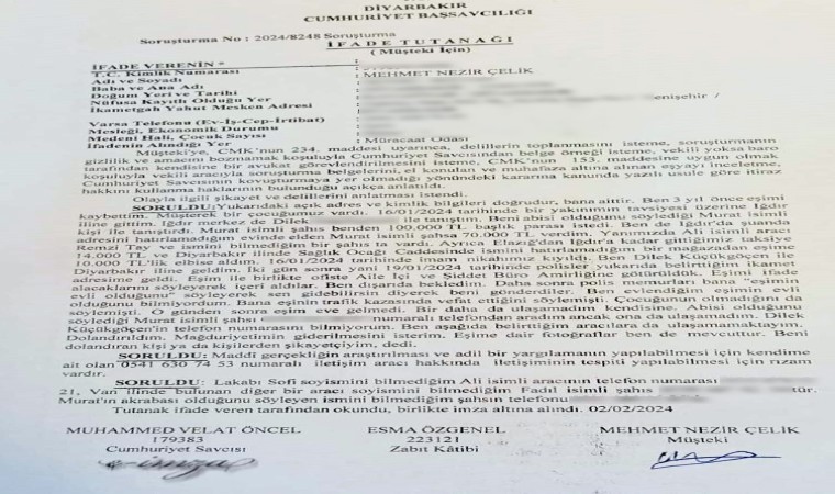 “Diyarbakır’ın Yenişehir ilçesi Fabrika Mahallesi’nde ikamet ediyorum. Bir çocuğum var. Eşim 2021’de vefat etti. Ben de çocuğum yalnız kalmasın diye, evimizde sıcak yemek pişsin diye tekrar biriyle evlenmeyi düşündüm. Elazığ’da Ali isminde bir arkadaşım bana Van’da Fadıl isminde bir aracıyla Iğdır’da kız bulduklarını söyledi. Diyarbakır’dan araç kiralayıp Van’a, oradan Ağrı’ya, sonrasında Iğdır’a gittik. Orada Dilek K. (34) ile tanıştık. Dilek’in yanında ‘ağabeyim’ diye tanıttığı Murat diye biri vardı. Tanışıp kaynaştıktan sonra benden 100 bin TL başlık parası istediler. Ben bu miktarın çok olduğunu söyleyince başlık parasını 70 bin TL’ye indirdiler. Parayı Murat diye tanıttığı ağabeyine verdim. Anlaştıktan sonra Iğdır’da dini nikah kıydık. 16 Ocak’ta Dilek’i Diyarbakır’a getirdim. Dilek Diyarbakır’da 3 gün boyunca bizim evde kaldı.”