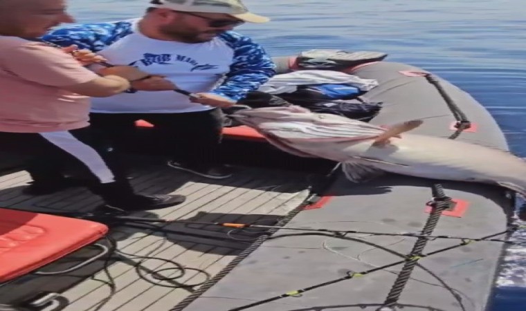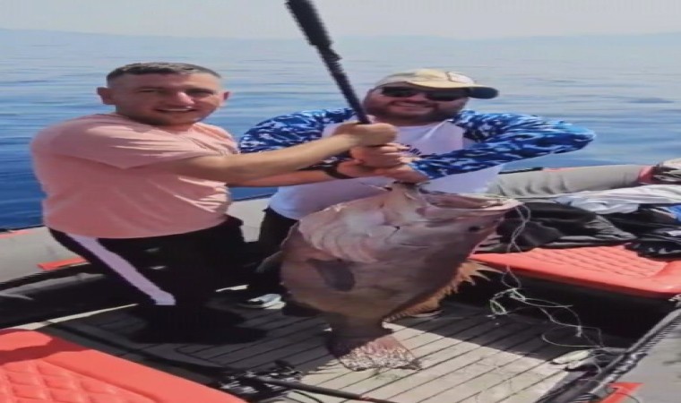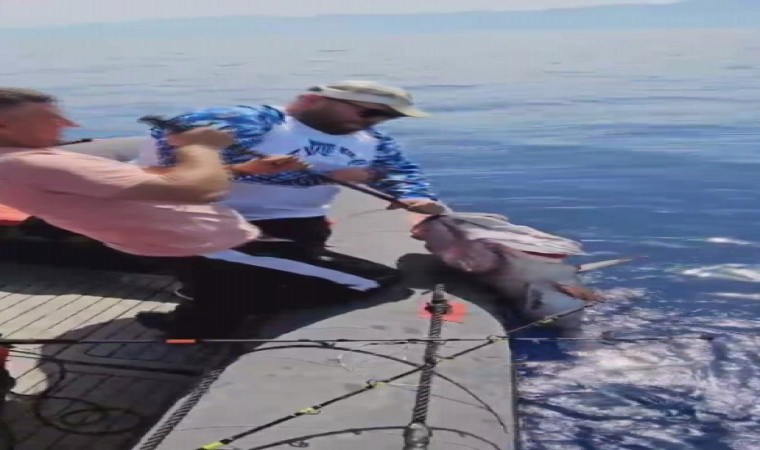 Hatay’da evlilik yıl dönümünde botla Akdeniz’e açılan amatör balıkçı Emrah Baz’ın oltayla 40 buçuk kiloluk devasa balığı yakalama anı cep telefonu kamerasına yansıdı. Balık tutkunlarını heyecanlandıran görüntüde Baz’ın ve arkadaşının balığı güçlükle bota çekmeyi başardığı görüldü.