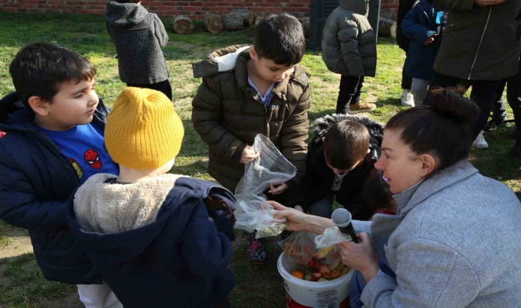 Kompost kurulumunu uygulamalı olarak anlatan çiftçi Eylem Suer, bitkisel ve hayvansal atıkların geri dönüştürülerek organik gübre oluşturulmasını ve tekrar toprakla buluşmasının öyküsünü minik öğrencilere anlayabilecekleri bir dilde anlattı. 2020 yılından beri onarıcı tarımla uğraştığını söyleyen Suer, kompostun toprağın ihtiyacı olan gübreyi doğal yollarla vermek için çok büyük bir araç olduğunu ifade ederek, “Bugün burada ESA öğrencilerimize geri dönüşümün ne kadar önemli olduğunu, aslında hiçbir şeyin çöp olmadığını, doğaya tekrar kazandırılabileceğini uygulamalı olarak gösterdik. Kompost kutusunda bir araya gelen çöplerin bir zaman sonra toprağa geleceğini ve doğayı kirletmeden de iyi bir şeyler yapabileceğimizi gösterdik” diye konuştu. Öğrenciler daha sonra evlerinden getirdikleri organik atıkları kompost kutusuna atarak, Suer’e merak ettikleri sordu.