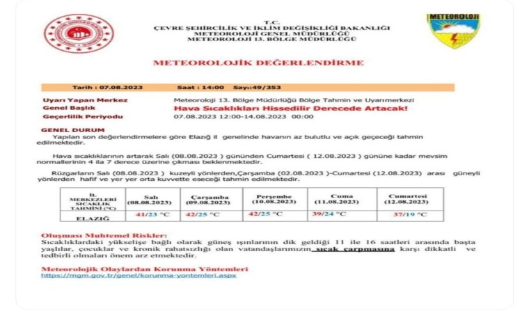 Meteoroloji 13. Bölge Müdürlüğü Bölge Tahmin ve Uyarı Merkezinden yapılan açıklamada, hava sıcaklıklarının yarından itibaren hissedilir düzeyde artacağı belirtildi. Açıklamada, "Yapılan değerlendirmelere göre, Elazığ il genelinde havanın az bulutlu ve açık geçeceği tahmin edilmektedir. Hava sıcaklıklarının artarak salı gününden cumartesi gününe kadar mevsim normallerinin 4 ila 7 derece üzerine çıkması beklenmektedir. Sıcaklıkların yükselişe bağlı olarak güneş ışınlarının dik geldiği saat 11.00 ile 16.00 saatleri arasında başta yaşlılar, çocuk ve kronik rahatsızlığı olan vatandaşlarımızın sıcak çarpmasına karşı dikkatli ve tedbirli olmaları önem arz etmektedir" denildi.