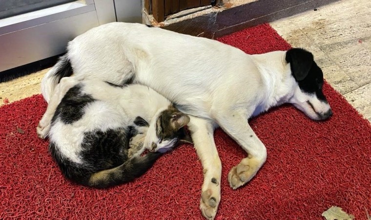 Aydın’ın İncirliova ilçesinde bulunan Tarihi Hangar Kafe ve Restoran’ın giriş kapısında koyun koyuna yatan kedi ve köpeğin sıra dışı samimiyetini görenler şaşırıp kalırken, ezeli düşmanların dostluğu görenlerin içini ısıtıyor.