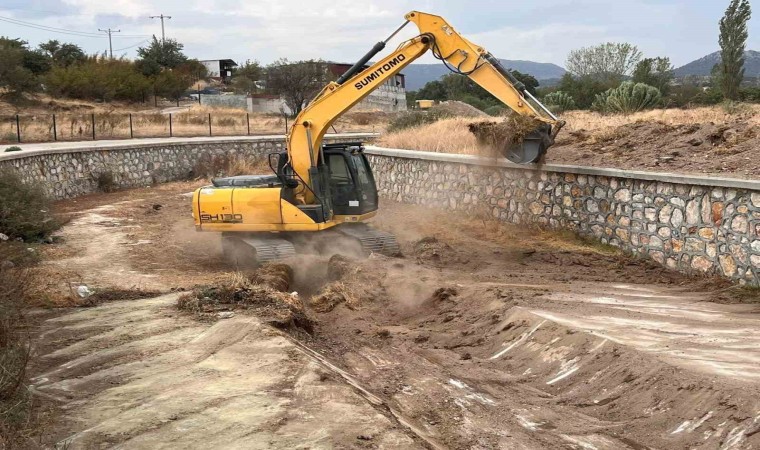 Ezine Belediyesi ekipleri, iş makineleriyle Akçin Çayı ve Üsküfçü deresindeki su akış yataklarında biriken kum, çakıl ve yabancı maddeleri temizliyor.
