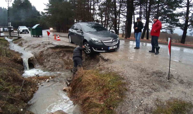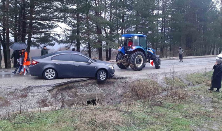 Bolu’da Abant Gölü Milli Parkına gelen ailenin içinde bulunduğu otomobil, park edildiği sırada şarampole devrilmekten son anda kurtuldu. Sel nedeniyle bozulan yolda otomobil askıda kaldı.