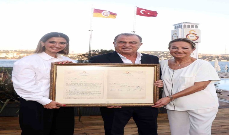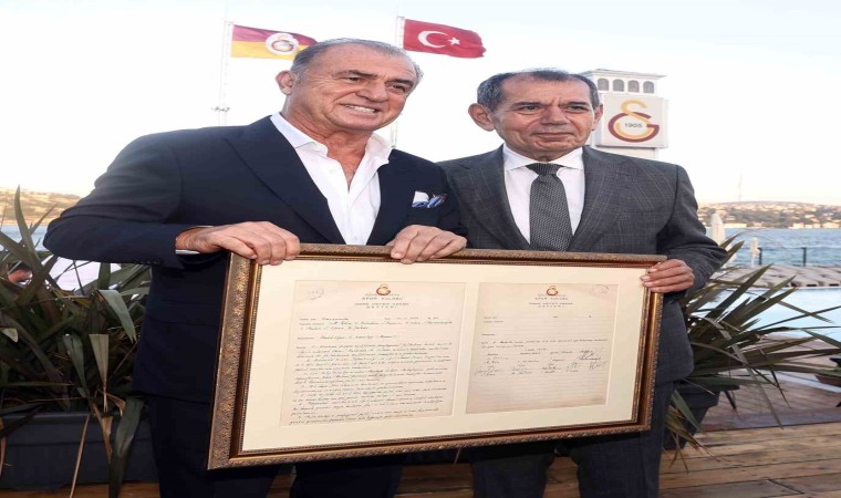 Dursun Özbek, günün anısına, Fatih Terim’in 50 yıl önceki transferi konusunda kulübün yönetim kurulunda alınan kararın belgesini hediye etti.