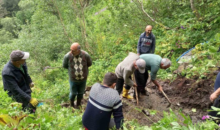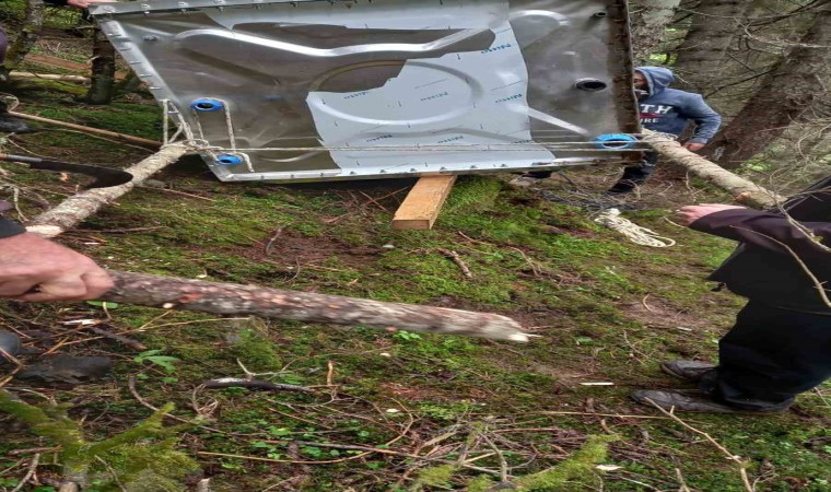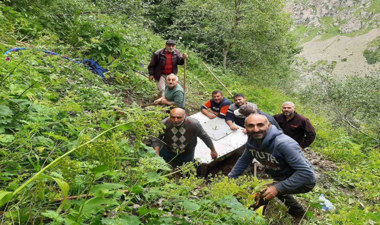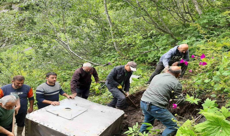Rize’nin Çamlıhemşin ilçesinde 300 kilogramlık su deposunu yerleştirileceği yere araç yolu olmayınca köylüler, 3 kilometre boyunca kalaslar üzerinde halatlar ile depoyu çekerek yerleştirecekleri yere götürdüler.